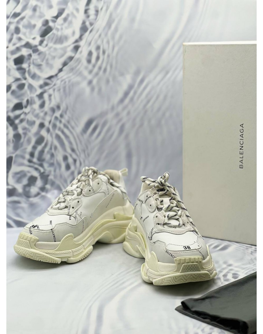 Tags:  (LIKE NEW) BALENCIAGA TRIPLE S ALLOVER LOGO SNEAKERS SIZE US 8 IN WHITE WITH BLACK CALFSKIN LEATHER -FULL SET-