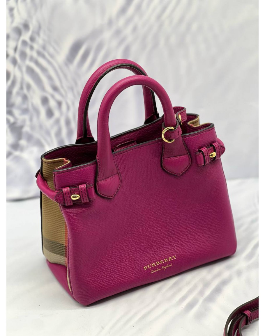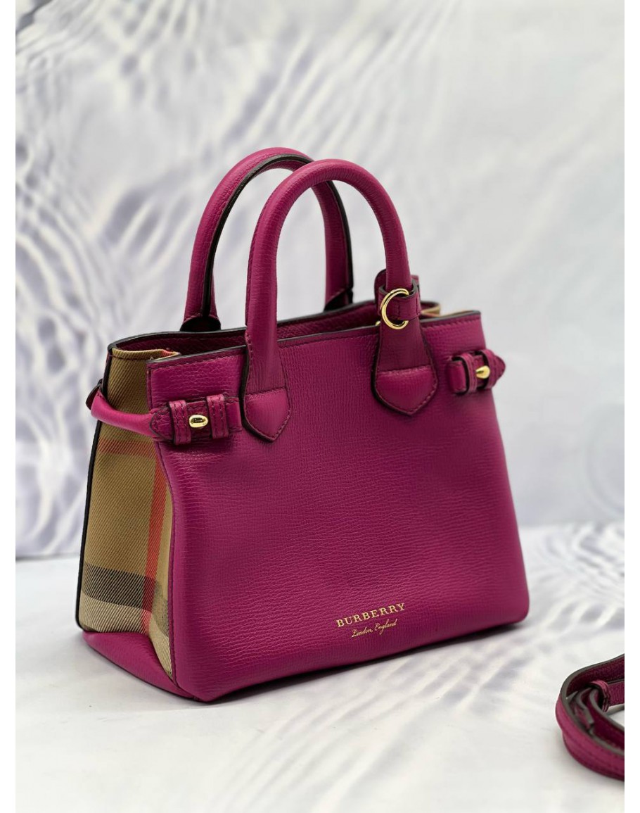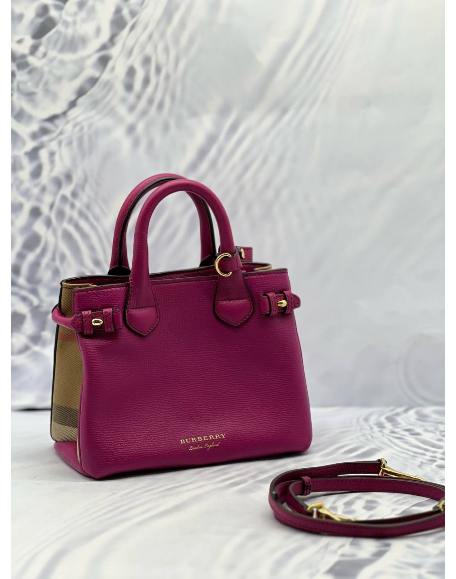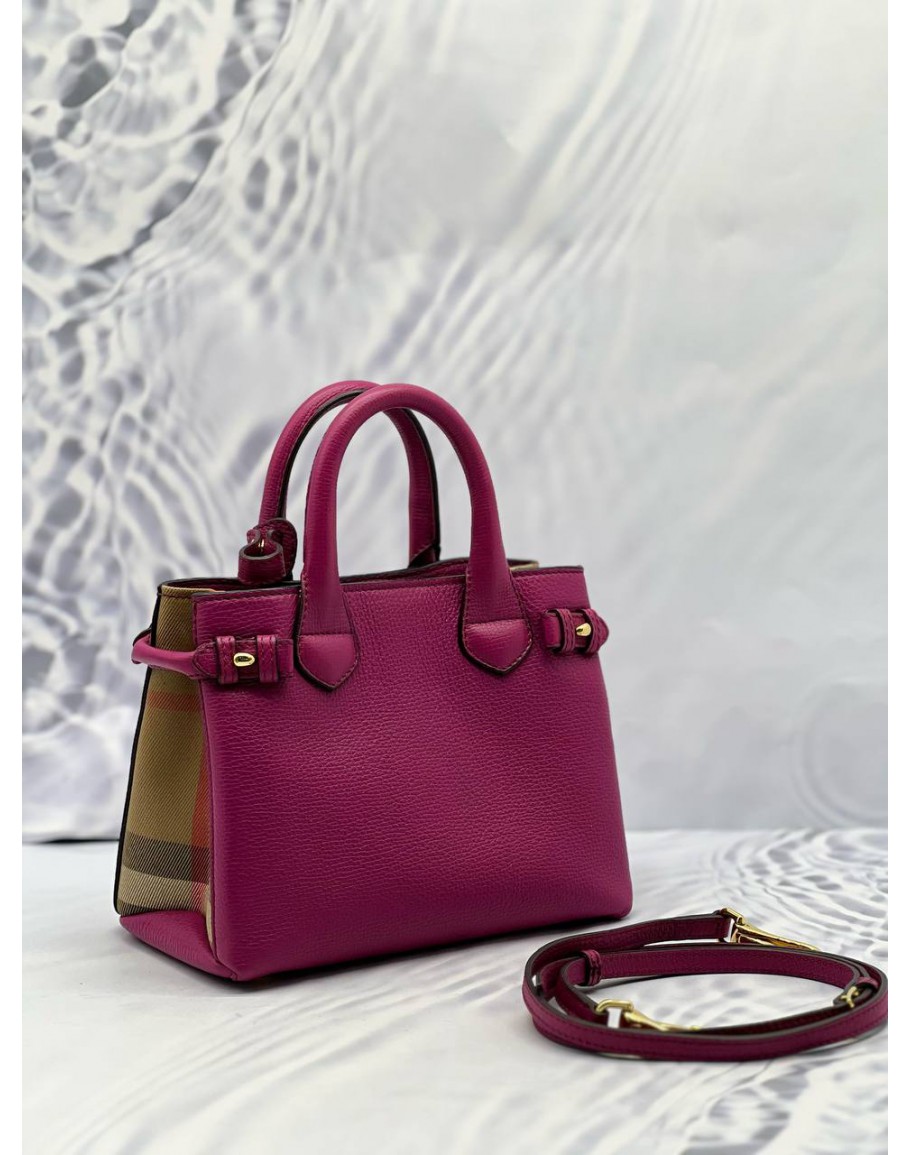 (LIKE NEW) BURBERRY BANNER TOP HANDLE BAG IN MAGENTA CALFSKIN LEATHER WITH BEIGE HOUSE CHECK CANVAS