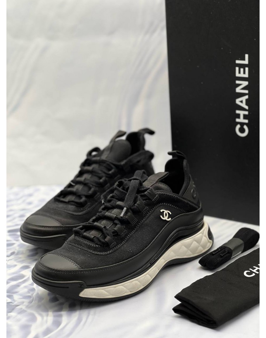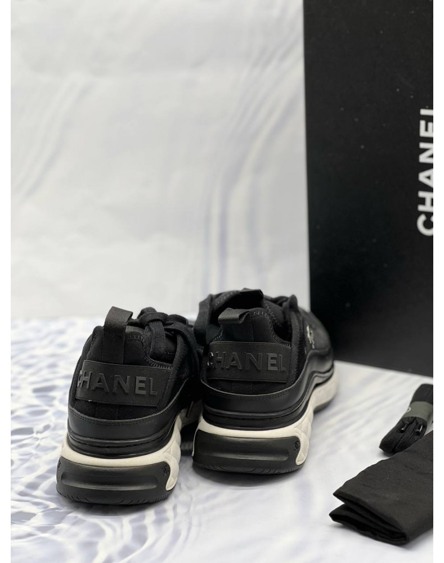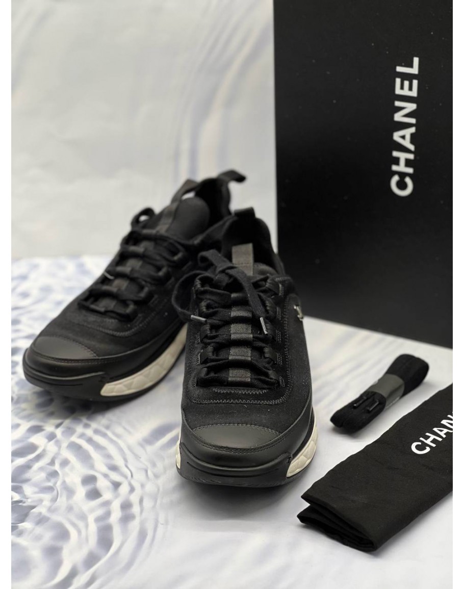 (LIKE NEW) CHANEL CC INTERLOCKING SNEAKERS SIZE 40 IN BLACK CALFSKIN LEATHER WITH TECHNICAL TEXTILE -FULL SET-