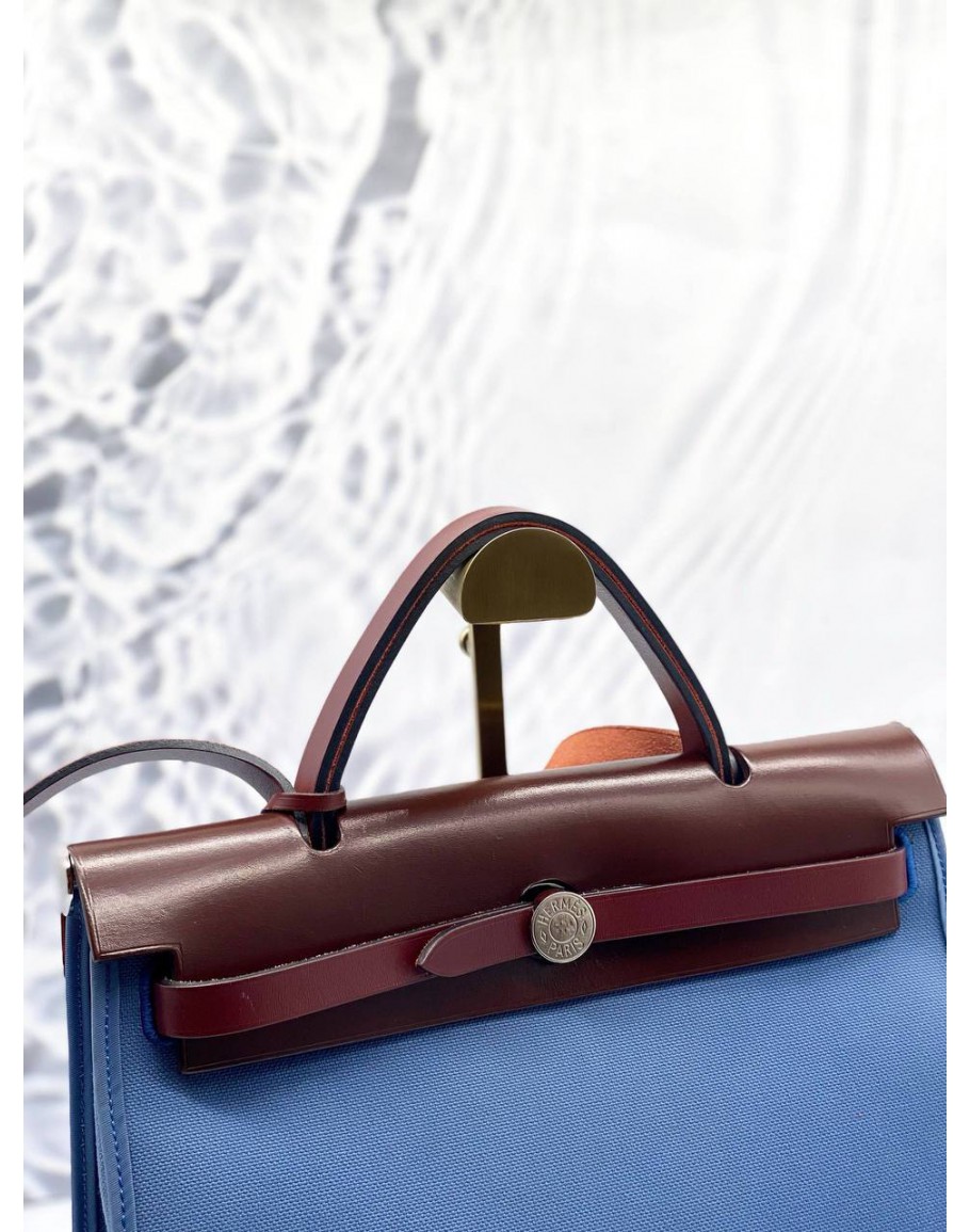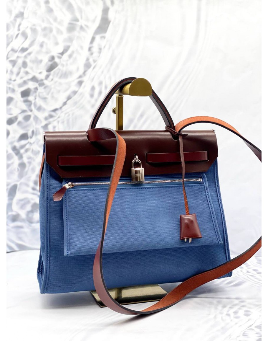 Tags: (LIKE NEW) HERMES HERBAG PM 31 IN BLEU TOILE CANVAS WITH RICH BROWN VACHE HUNTER LEATHER