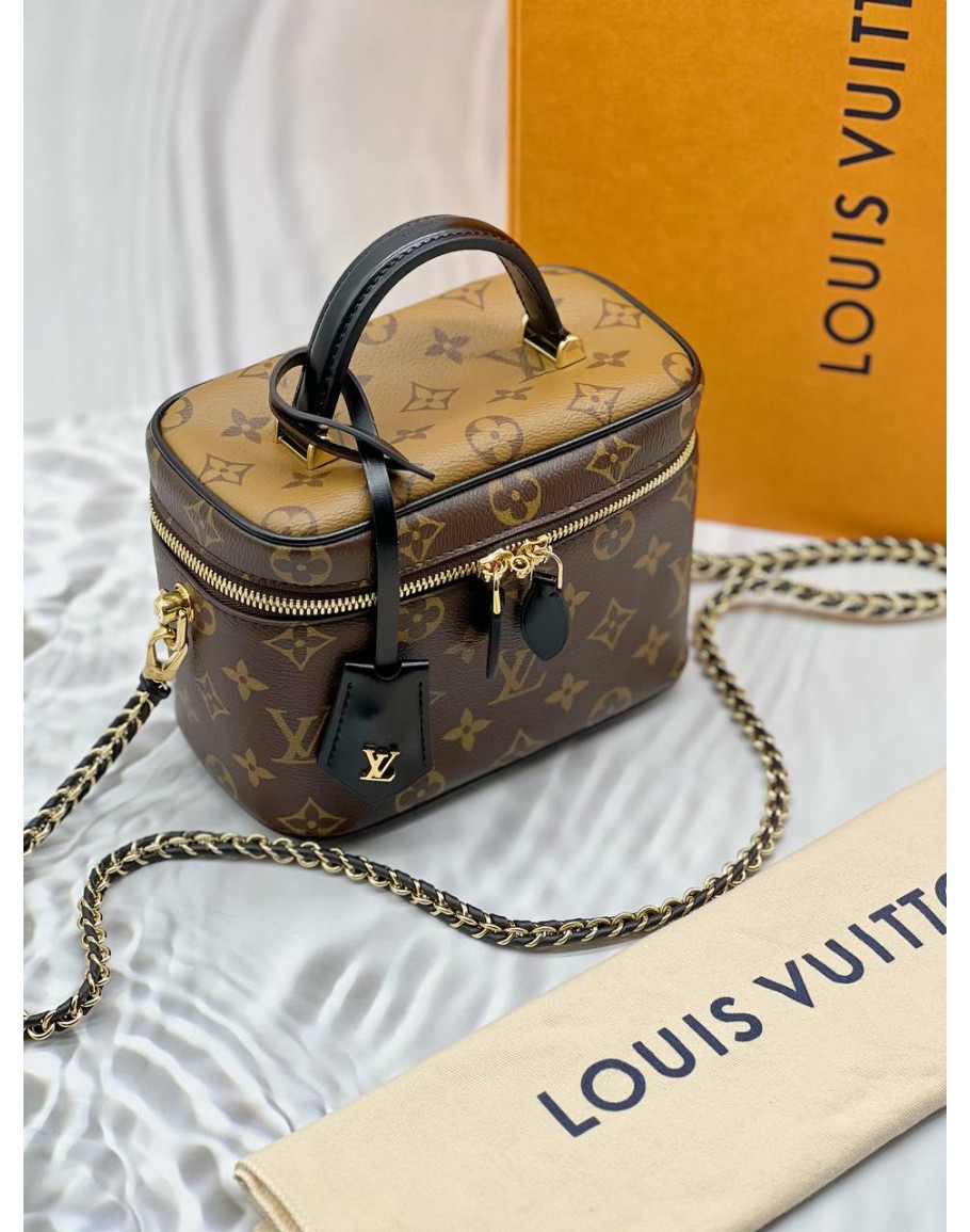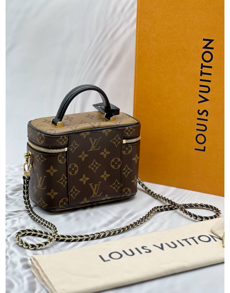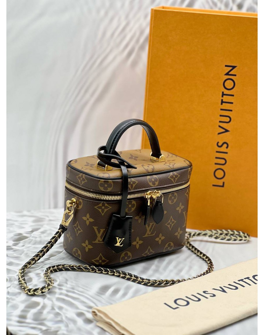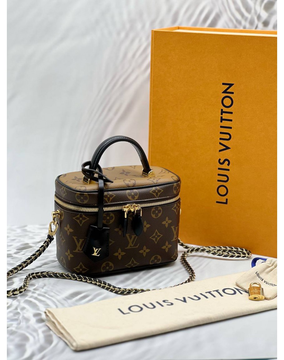 (LIKE NEW) MICROCHIP LOUIS VUITTON VANITY PM IN BROWN MONOGRAM REVERSE CANVAS WITH BLACK LEATHER -FULL SET-