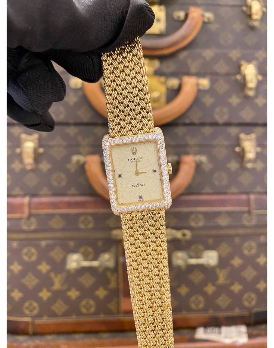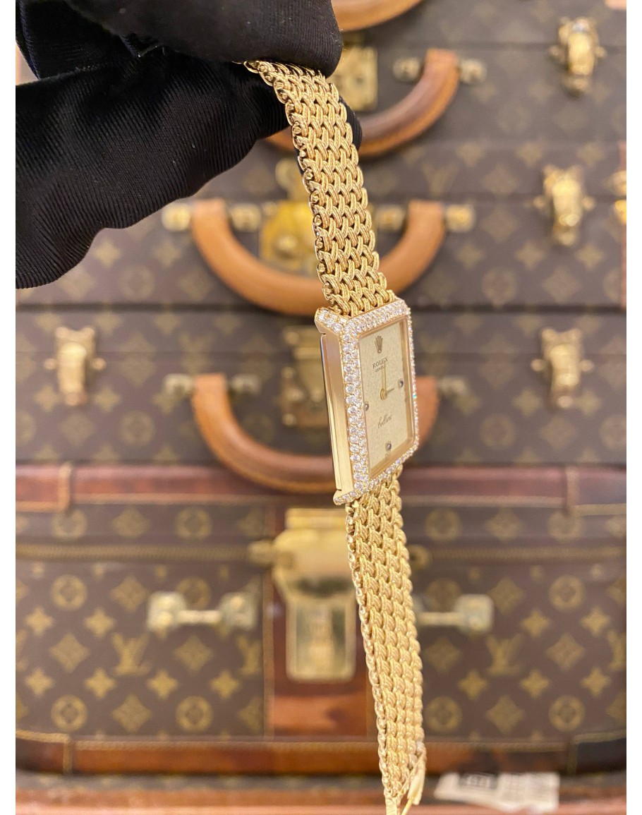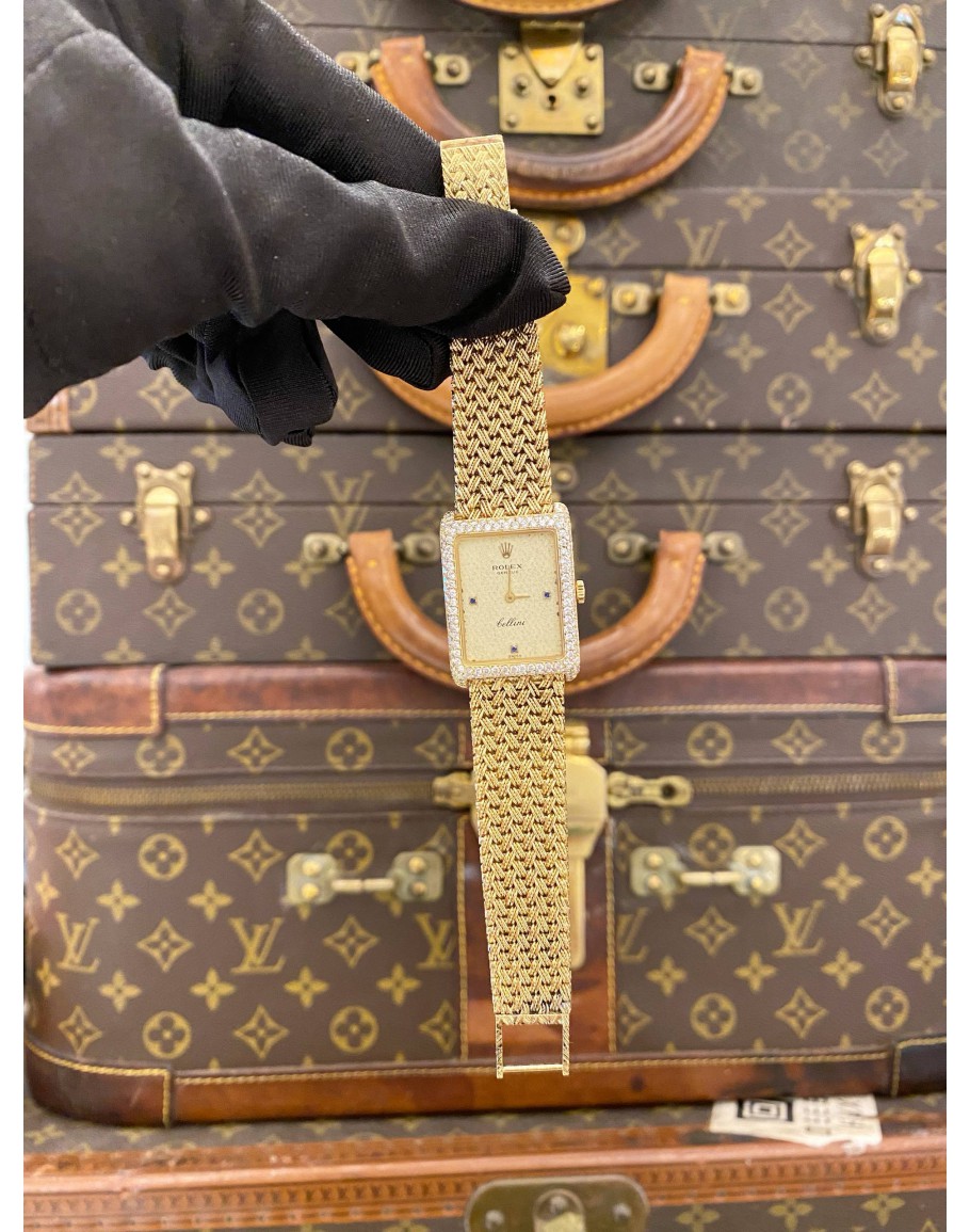 (LIKE NEW) ROLEX CELLINI FULL 18K 750 YELLOW GOLD FACTORY DIAMOND 3/6/9 BLUE SAPPHIRE INDICES REF 4930 GOLD TEXTURED DIAL 33MM X 24MM MANUAL WINDING WATCH
