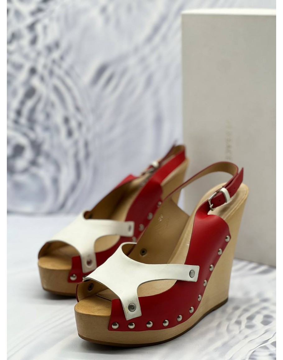 (LIKE NEW) VERSACE WEDGES SIZE 39 IN RED AND WHITE LEATHER WITH WOODEN SOLE