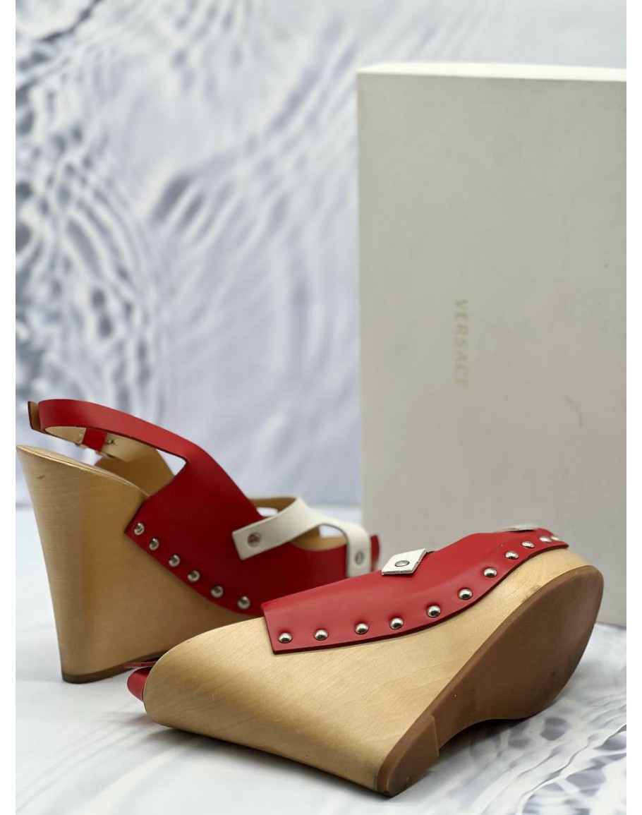 Tags: (LIKE NEW) VERSACE WEDGES SIZE 39 IN RED AND WHITE LEATHER WITH WOODEN SOLE