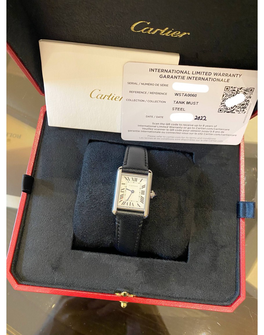 (UNUSED) 2022 CARTIER TANK MUST STEEL REF WSTA0060 SILVER WITH ROMAN NUMERALS DIAL 22MM QUARTZ WATCH -FULL SET-
