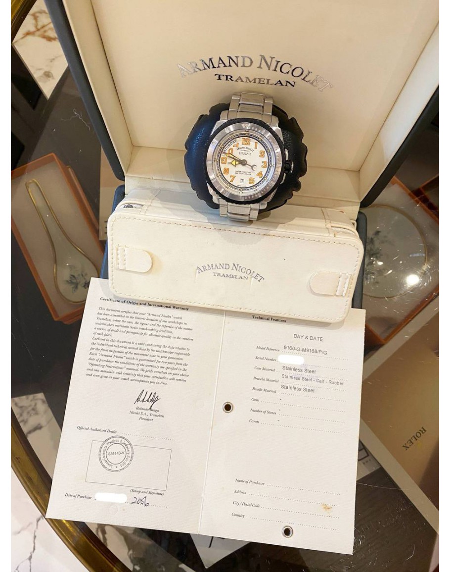 Tags: 2006 ARMAND NICOLET S05 DAY DATE REF 9160-G-M9168 WHITE DIAL 44MM AUTOMATIC WATCH -FULL SET-