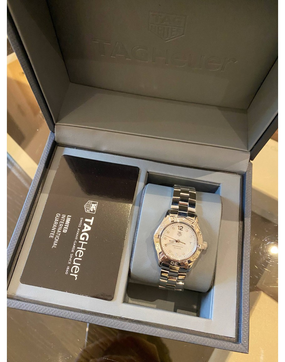(PRE-OWNED) -FULL SET- GENDER : WOMEN PRISTINE CONDITION : 9.5/10 BRAND : TAG HEUER YEAR : 2014 MODEL : AQUARACER LADY REFERENCE NUMBER : WAF1415 CASE DIAMETER : 27MM MOVEMENT : QUARTZ BEZEL MATERIAL : STAINLESS STEEL CASE MATERIAL : STAINLESS STEEL BRACELET MATERIAL : STAINLESS STEEL CLASP : FOLDING CLASP CLASP MATERIAL : STAINLESS STEEL DIAL : MOTHER OF PEARL WITH DIAMONDS COMES WITH CERTIFICATE CARD & BOX