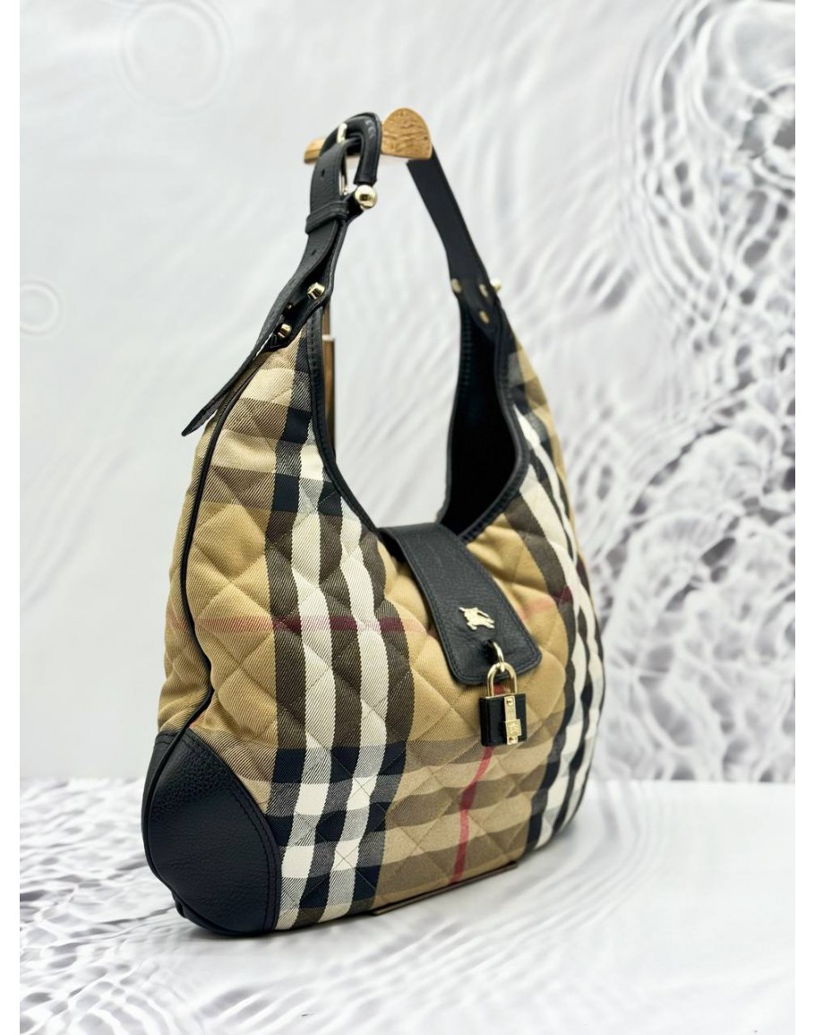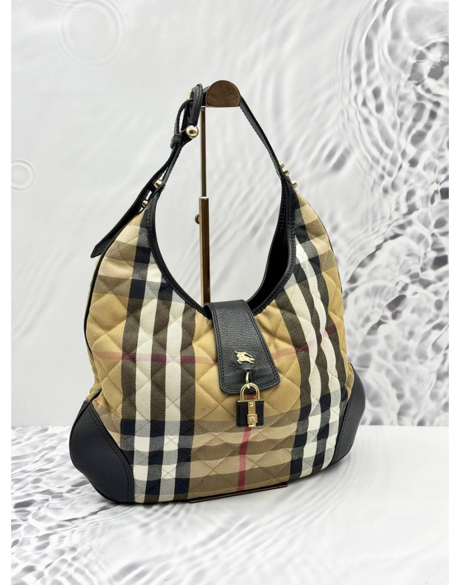 BURBERRY BROOK HOBO SHOULDER BAG IN BEIGE CANVAS AND BLACK CALFSKIN LEATHER