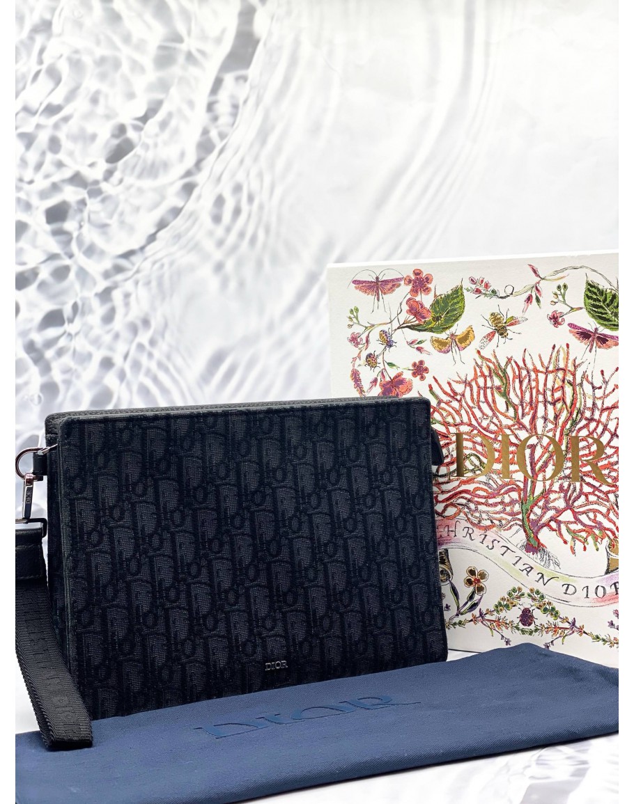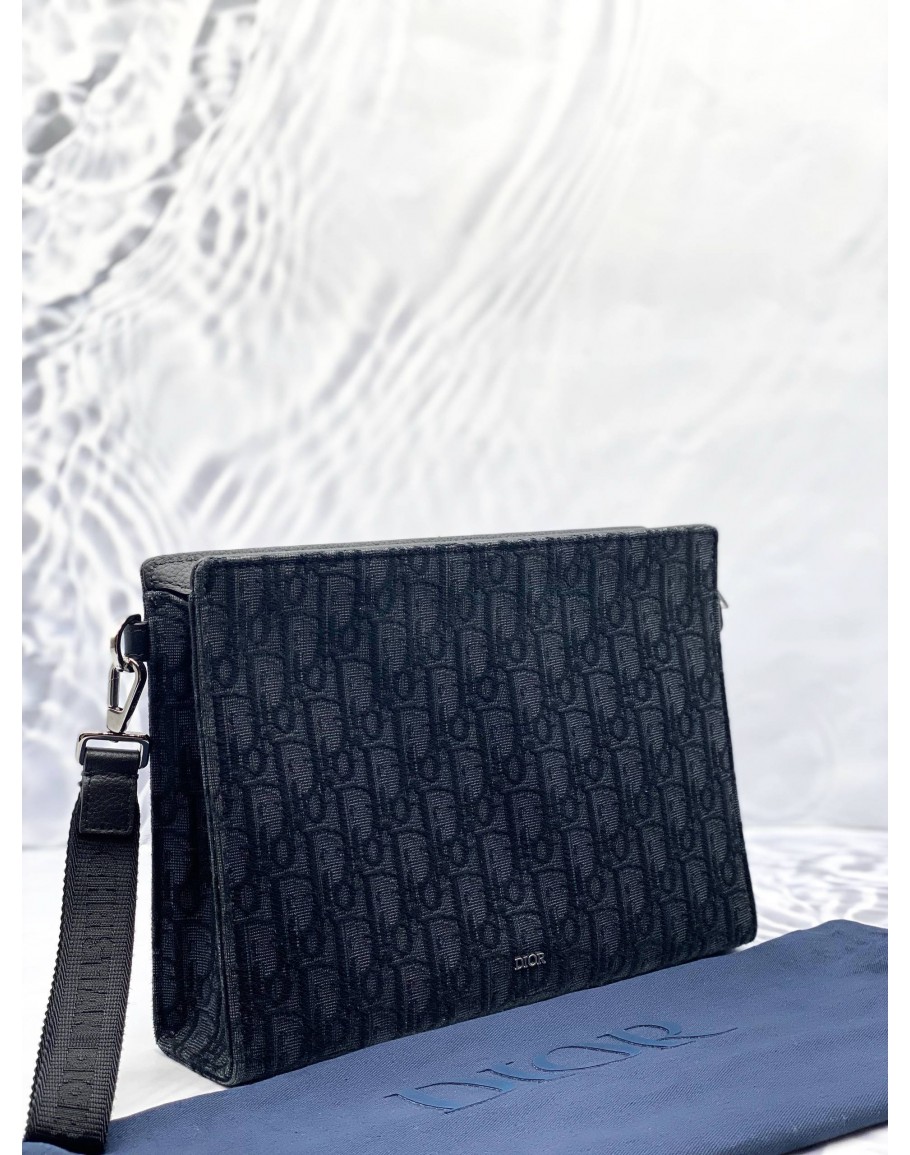 CHRISTIAN DIOR A5 TRIANGLE POUCH IN BLACK DIOR OBLIQUE JACQUARD WITH GRAINED CALFSKIN LEATHER -FULL SET-