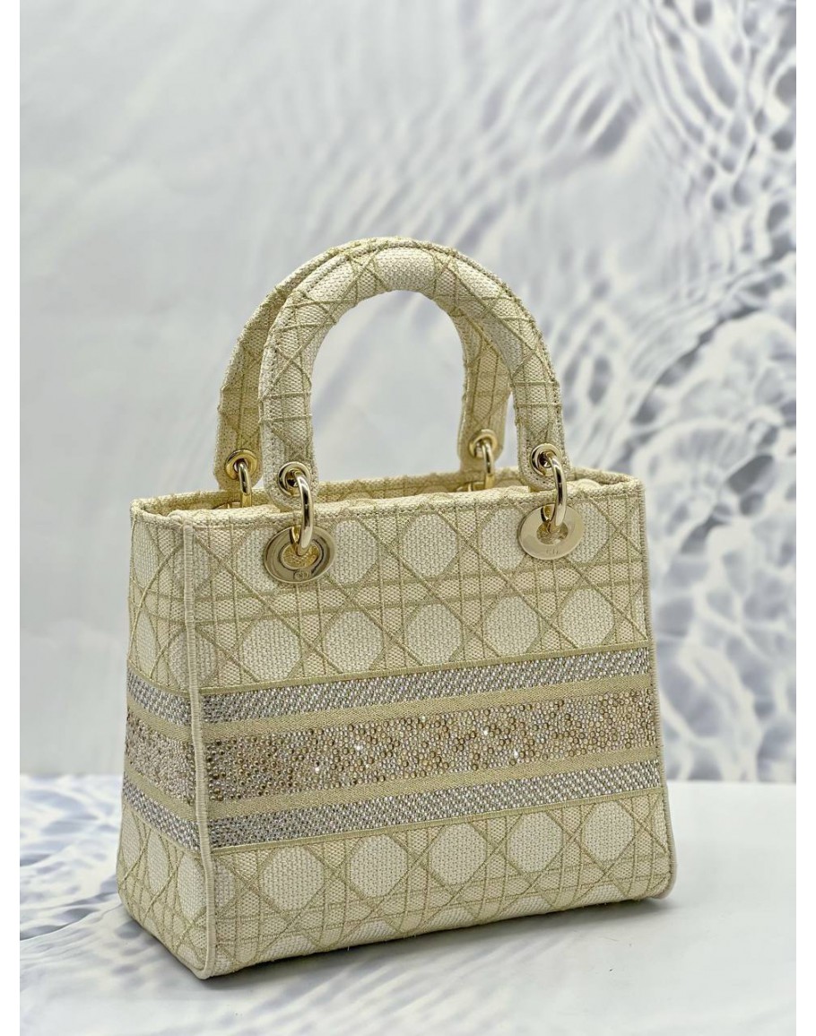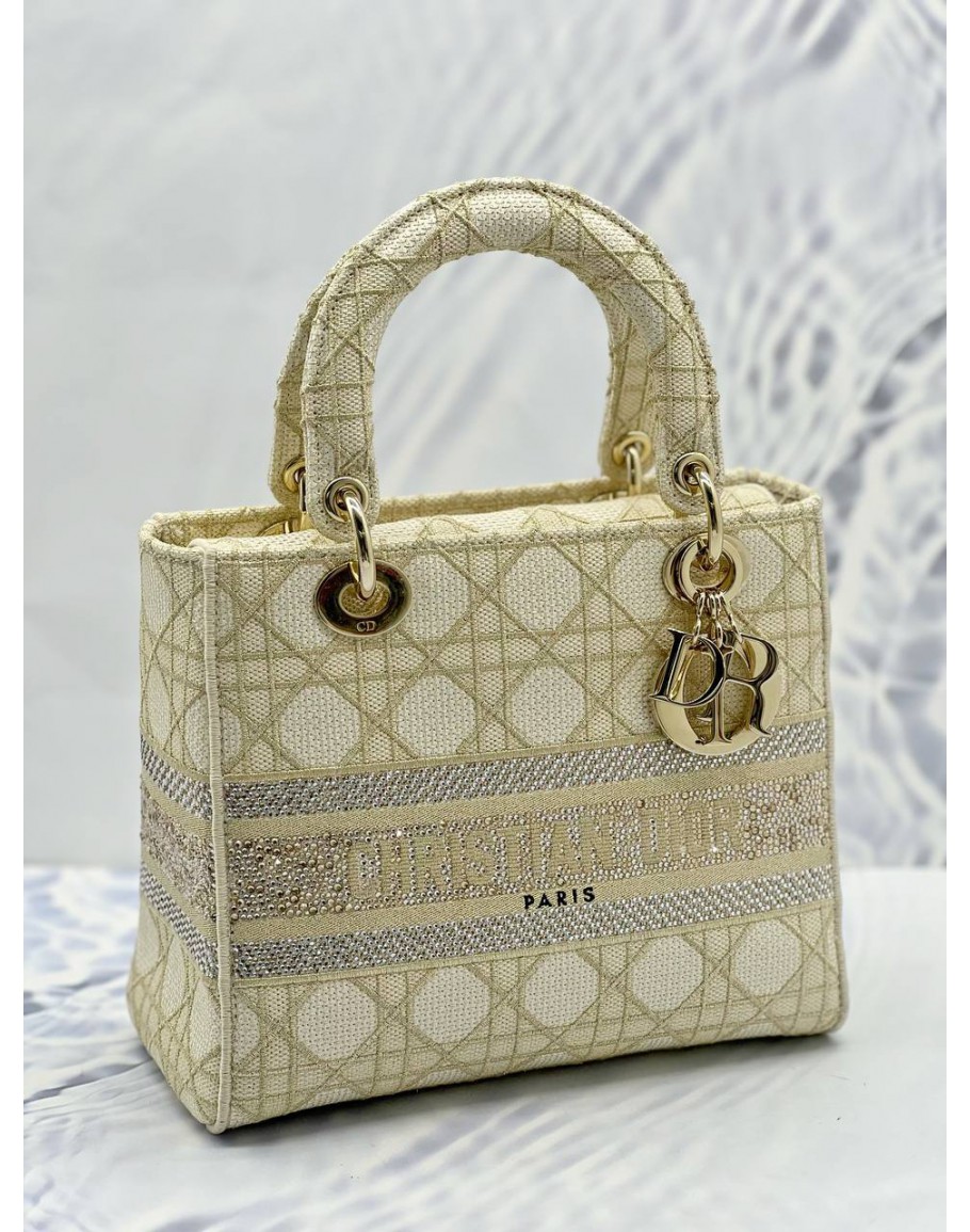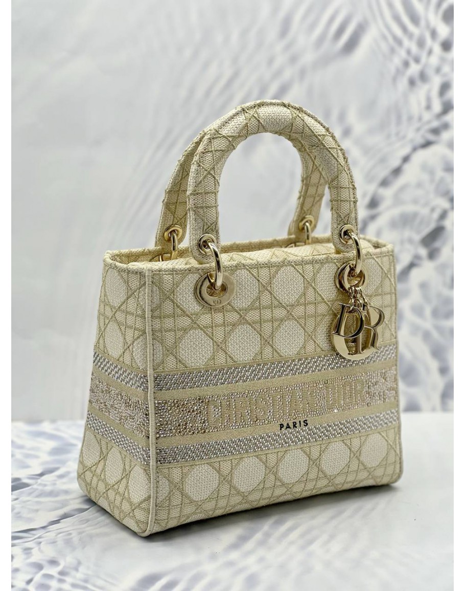 Tags: (LIKE NEW) CHRISTIAN DIOR MEDIUM LADY DIOR D-LITE IN OFF WHITE WITH GOLD EMBROIDERED CANVAS
