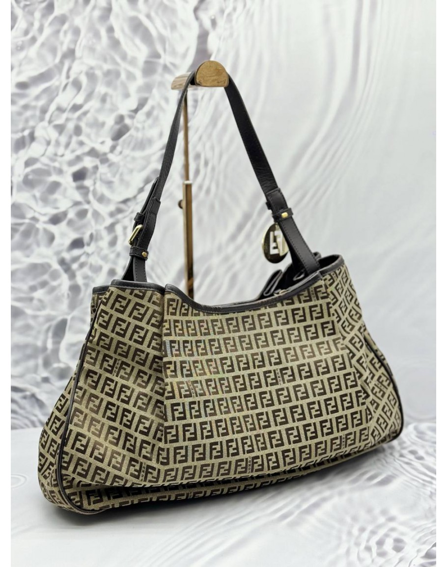 FENDI HOBO SHOULDER BAG IN BEIGE CANVAS WITH DARK BROWN LEATHER