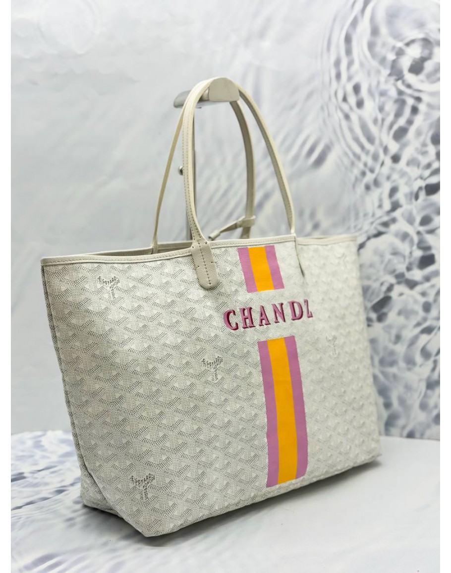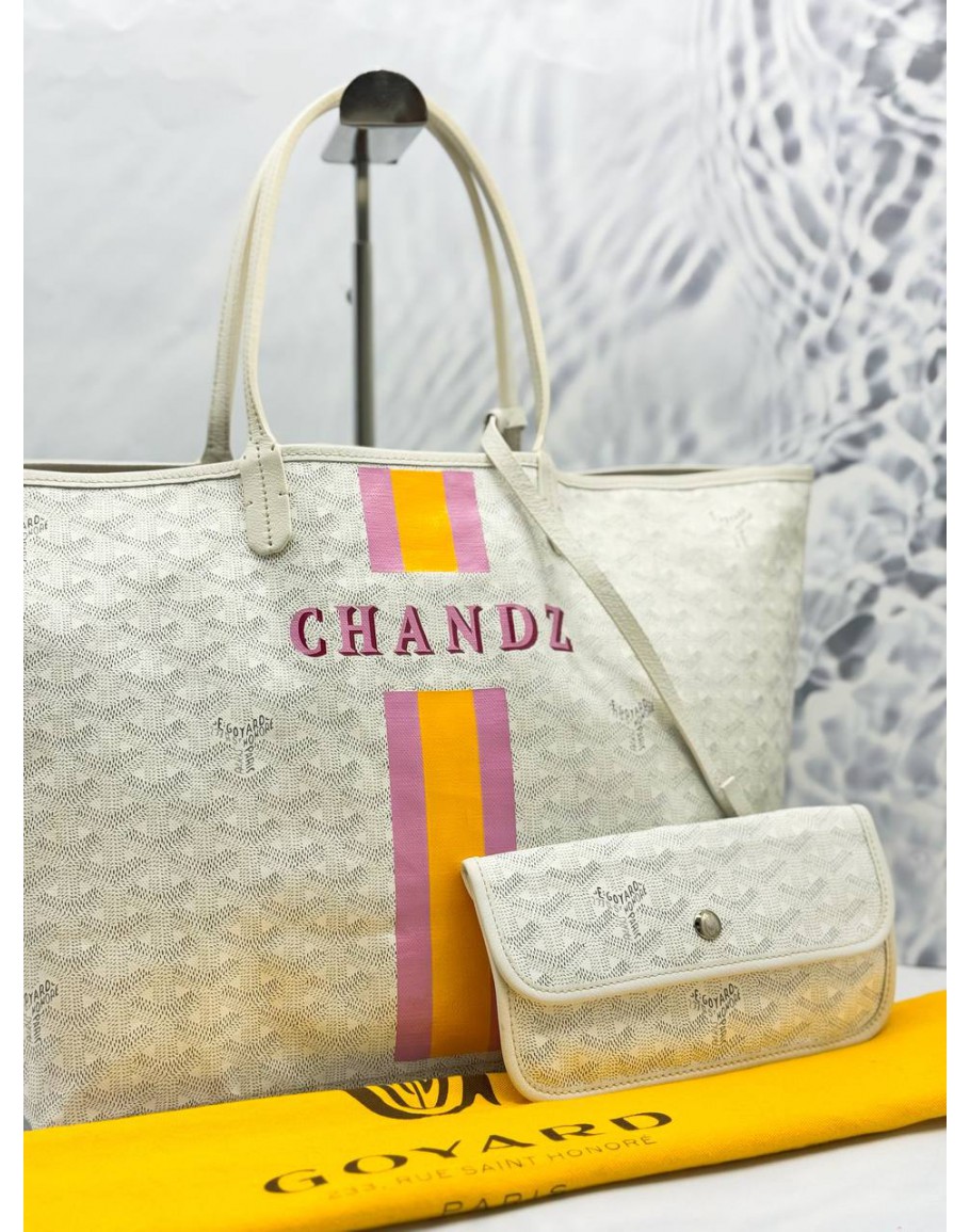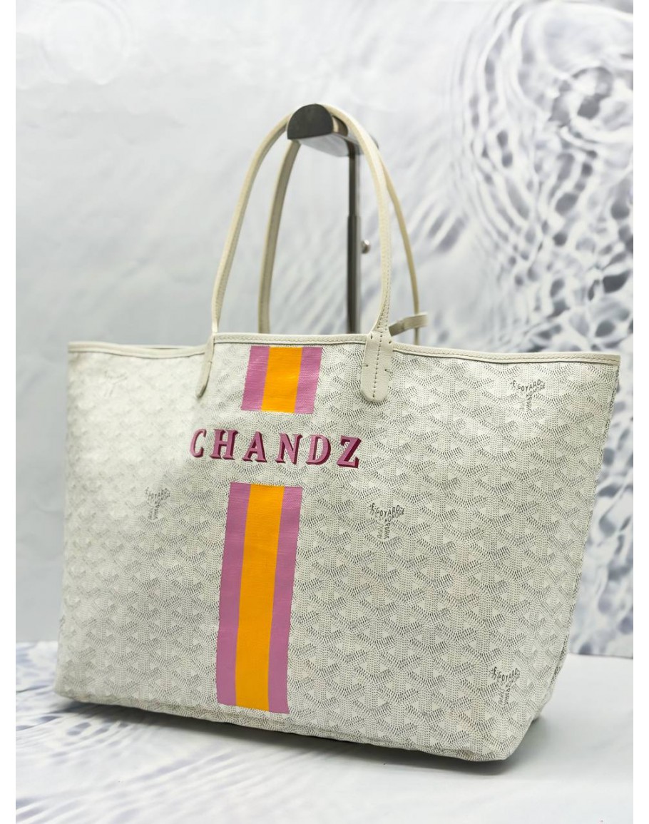 Tags:  GOYARD SAINT LOUIS PM STRIPES AND INITIALS TOTE SHOULDER BAG IN WHITE GOYARDINE CANVAS WITH CHEVROCHES CALFSKIN LEATHER