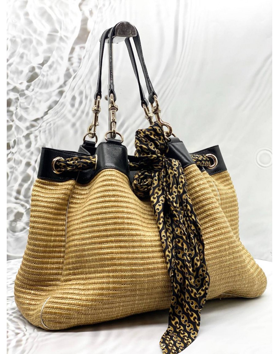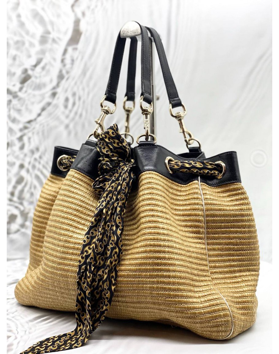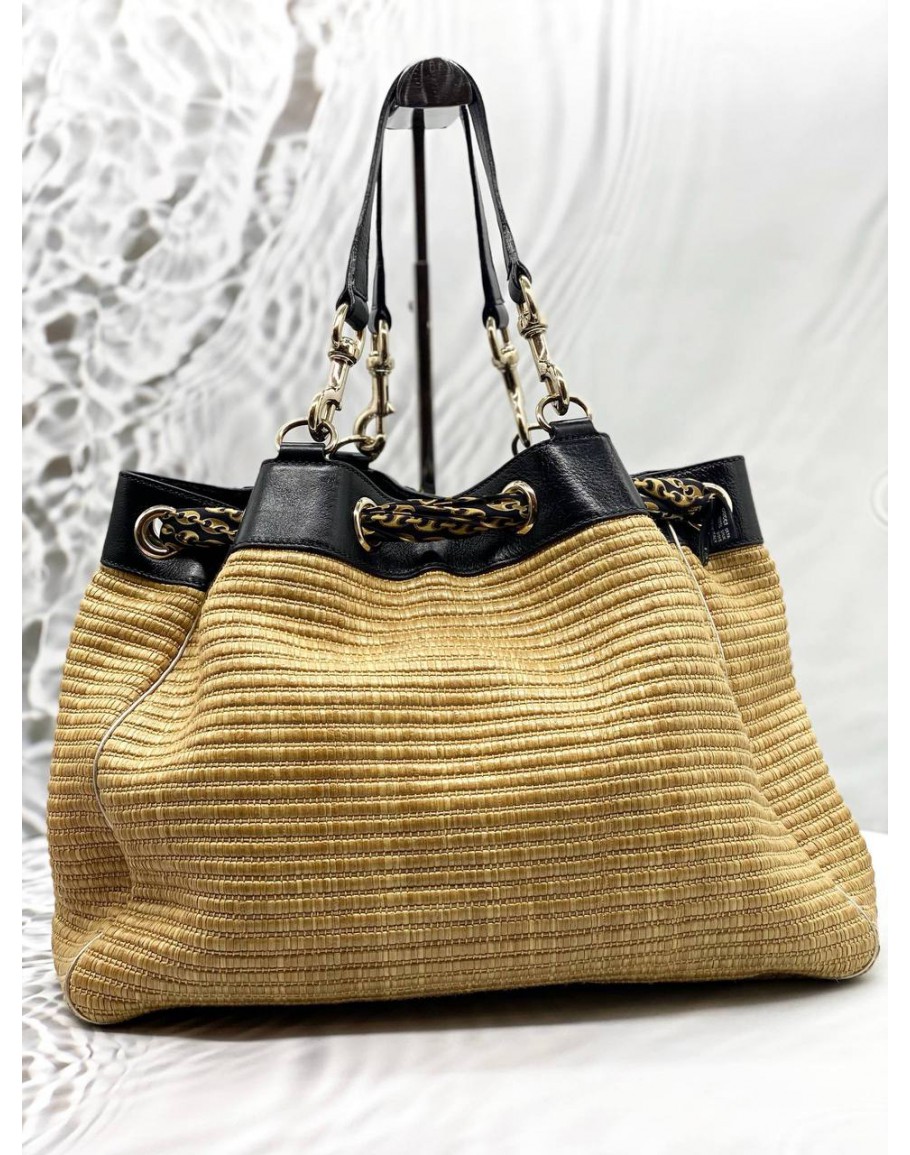 Tags: GUCCI POSITANO TOTE BAG IN BEIGE WOVEN WITH BLACK LEATHER