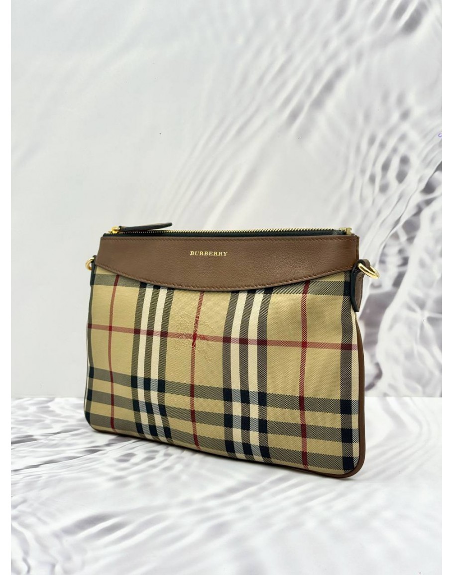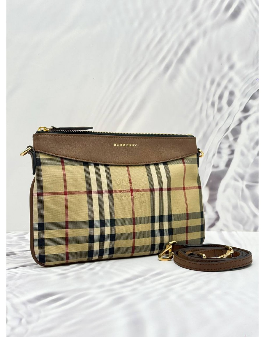 Tags: (LIKE NEW) BURBERRY PEYTON CROSSBODY BAG IN BEIGE HAYMARKET CHECK CANVAS WITH BROWN CALFSKIN LEATHER