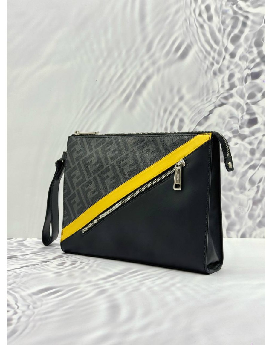 Tags: (LIKE NEW) FENDI DIAGONAL CLUTCH IN GREY CANVAS AND BLACK CALFSKIN LEATHER WITH YELLOW DETAIL