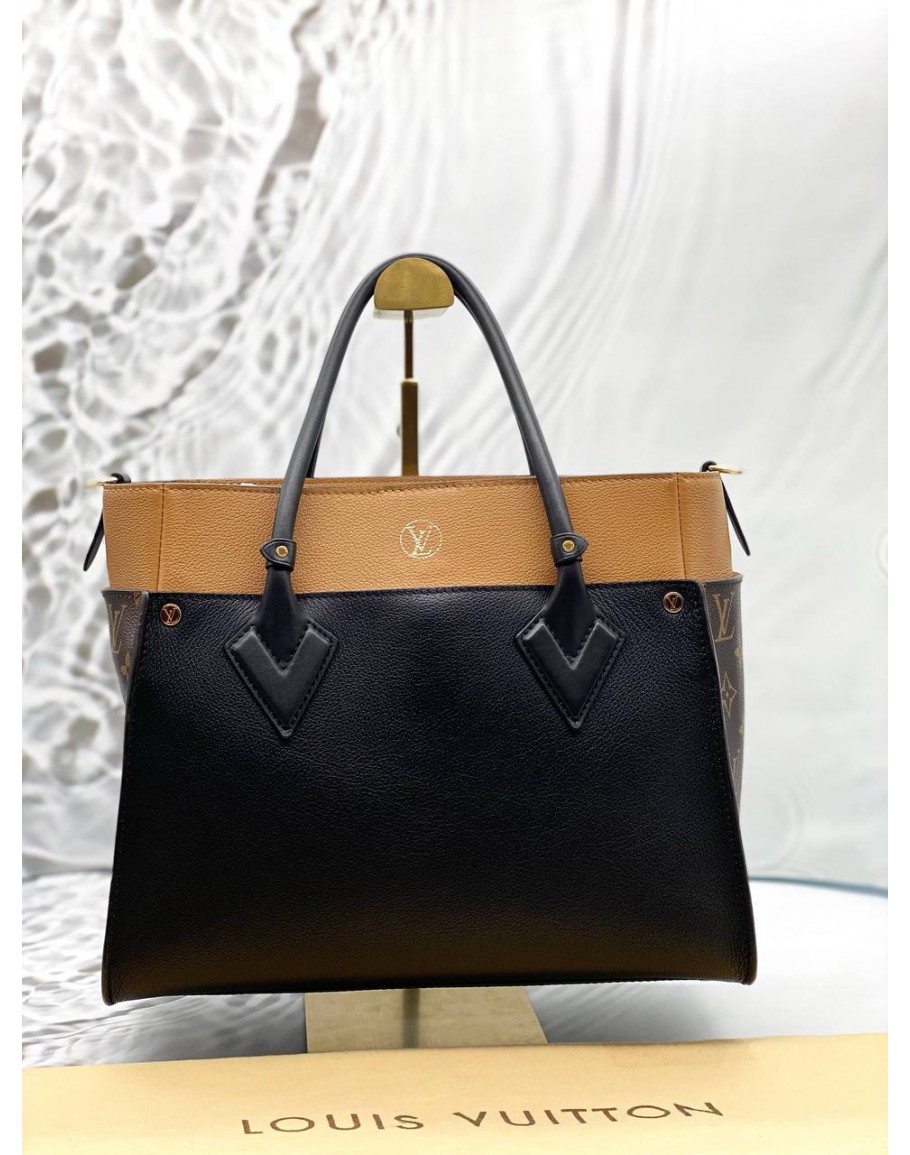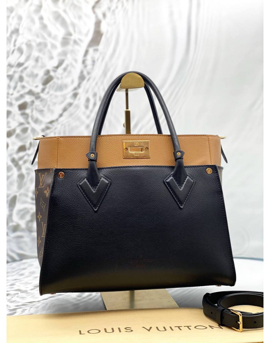 LOUIS VUITTON ON MY SIDE MM TOTE BAG IN BROWN MONOGRAM CANVAS WITH BLACK AND BROWN LEATHER