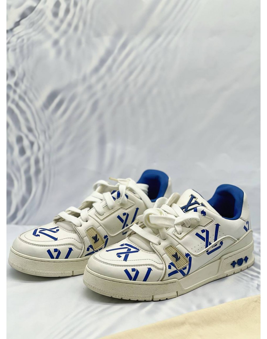 LOUIS VUITTON TRAINER SNEAKERS SIZE 5 IN WHITE WITH BLUE LEATHER
