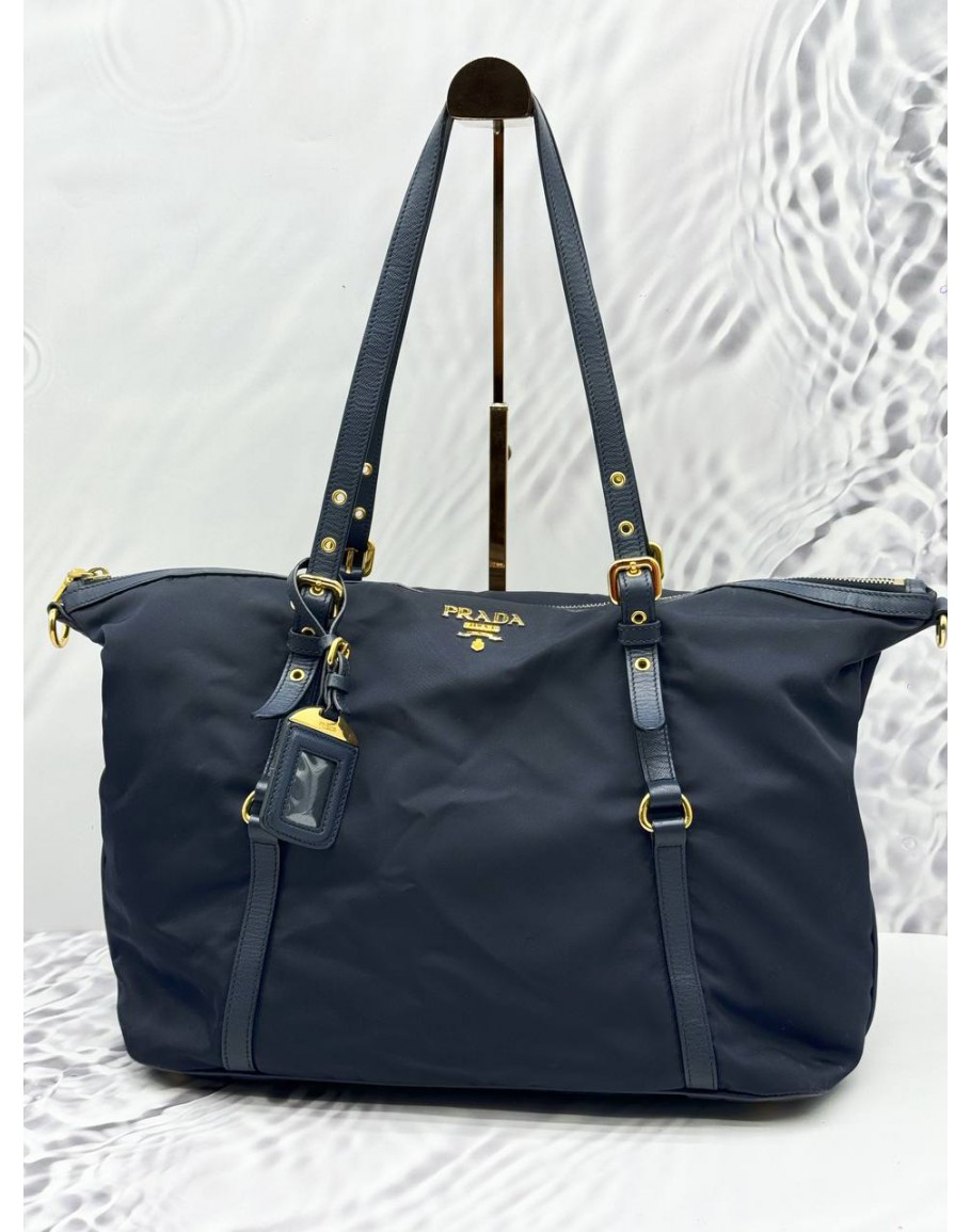 Tags: PRADA TOTE SHOULDER BAG IN NAVY BLUE NYLON WITH CALFSKIN LEATHER