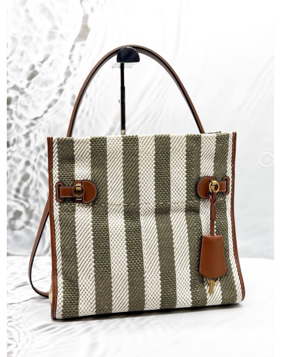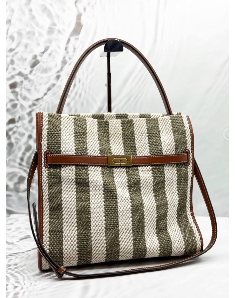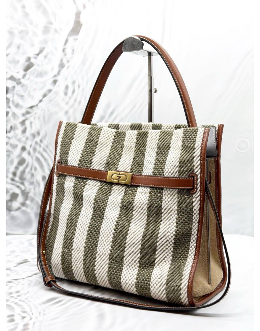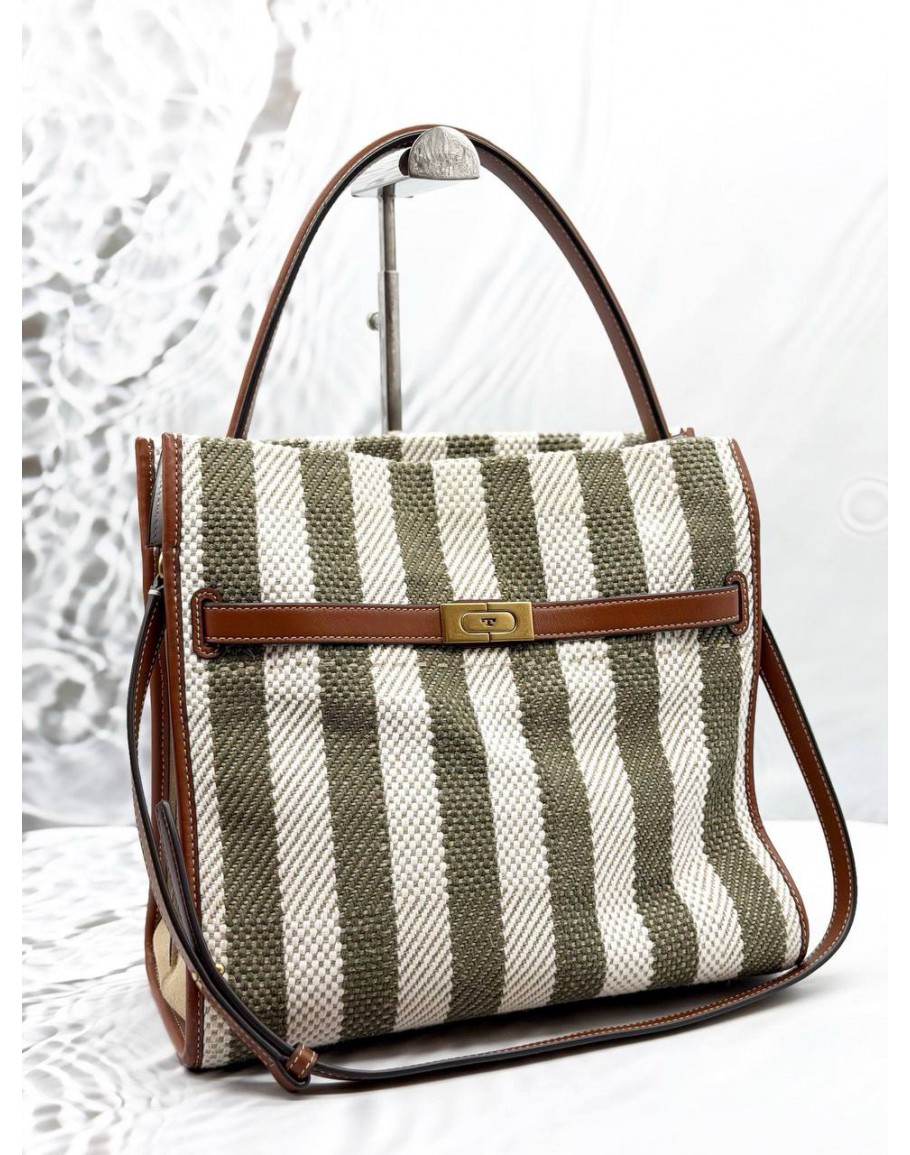 Tags: TORY BURCH LEE RADZIWILL STRIPED TOTE BAG IN KHAKI WITH OFF WHITE CANVAS AND BROWN LEATHER