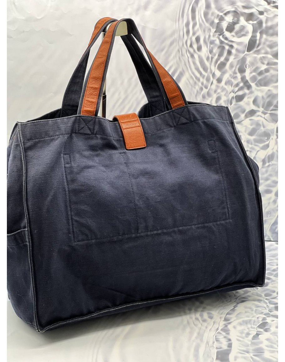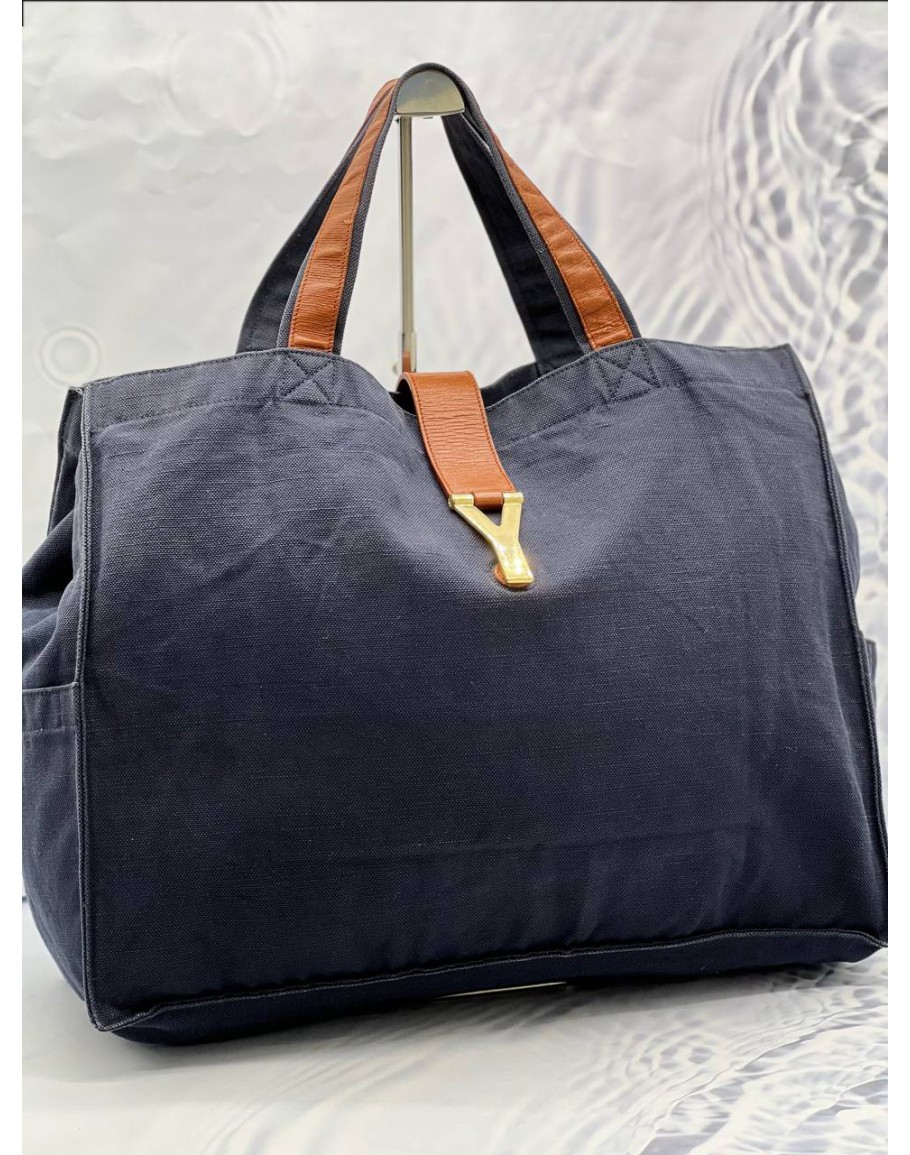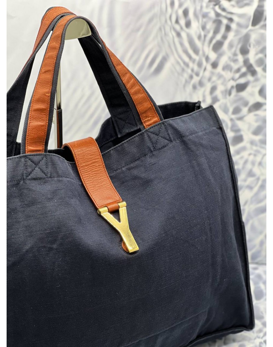 YSL SAINT LAURENT TOTE BAG IN DARK BLUE CANVAS WITH BROWN CALFSKIN LEATHER